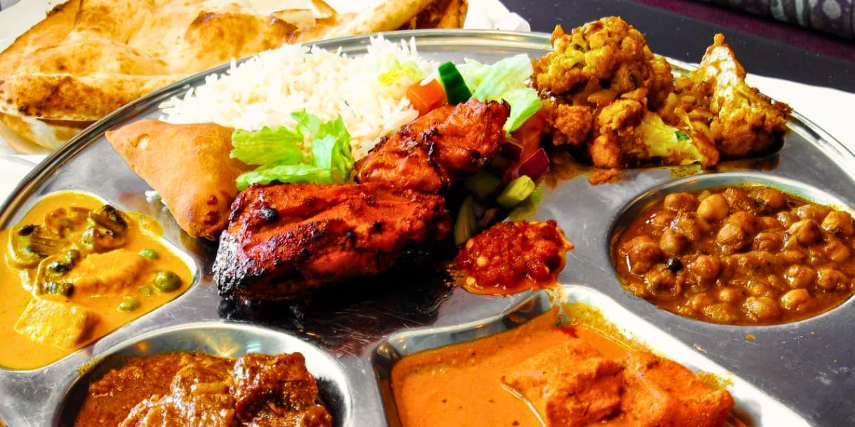 Indian Cuisine by the Lake’s thali, served with curries, rice, naan, and sides.